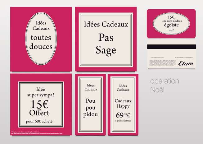 Conception, rédaction et création de l’ensemble des éléments de Noël Etam 2011 et 2012. Prise de vues et direction artistique du catalogue.